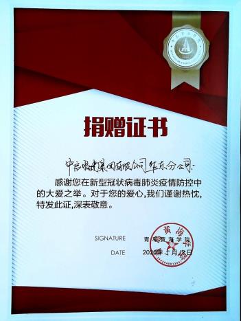 黃海學(xué)院基建中心李傳江主任及后勤保障部、疫情防控工作領(lǐng)導(dǎo)小組辦公室相關(guān)領(lǐng)導(dǎo)接受捐贈,對我公司的捐贈表示感謝,并為公司頒發(fā)捐贈證書。