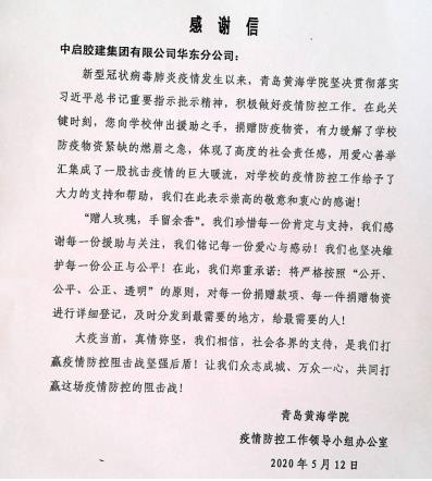 中啟膠建集團(tuán)華東分公司副經(jīng)理、青島中筑置業(yè)有限公司經(jīng)理李世杰代表公司進(jìn)行捐贈,并表示,中啟膠建集團(tuán)時刻以踐行社會責(zé)任為己任,大疫當(dāng)前,我公司愿盡綿薄之力與黃海學(xué)院共同擔(dān)當(dāng),共克時艱。隔山隔水不隔愛,封城封路不封心,讓我們眾志成城、守望相助,形成合力共同打贏這場疫情防控阻擊戰(zhàn)!