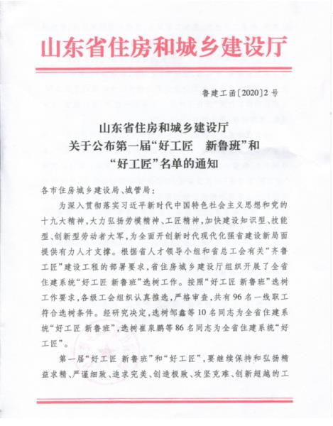 為深入貫徹落實中央加強和改進新時期產業工人隊伍建設改革要求,大力弘揚勞模精神、工匠精神,加快建設知識型、技能型、創新型勞動者大軍,為全面開創新時代現代化強省建設新局面提供有力人才支撐,根據省人才領導小組和省總工會“齊魯工匠”建設工程的工作部署及省住房城鄉建設廳實施方案,中啟膠建集團積極組織參加全省住建系統“好工匠 新魯班”選樹工作。