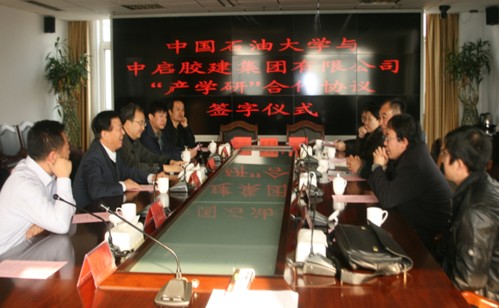 簽字儀式結束后,出席簽字儀式的雙方領導及集團中層以上管理人員在中啟集團大門口舉行了中國石油大學教學科研基地揭牌儀式。雙方領導分別就合作發展進行了講話。相信,在集團公司上下的共同努力下,在中國石油大學領導和專家的支持下,教學科研基地一定能夠順利實現預定的發展目標,能夠在未來的教學科研和集團公司技術發展等方面發揮更為突出的作用,為集團公司核心競爭能力的不斷提高和公司的發展做出更大的貢獻。
