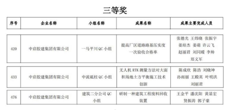 集團在省外QC成果也取得了較好的成績。膠州公司在安徽省參加的QC成果活動中榮獲一等獎1項,二等獎1項;建筑二公司在內蒙古自治區參加的QC成果活動中榮獲三等獎3項。