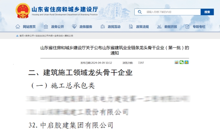 4月9日,山東省住房和城鄉建設廳公布了山東省建筑業全鏈條龍頭骨干企業(第一批)名單,我公司在施工總承包和外出施工兩類建筑施工領域均榮獲“山東省建筑業全鏈條龍頭骨干企業”稱號。
