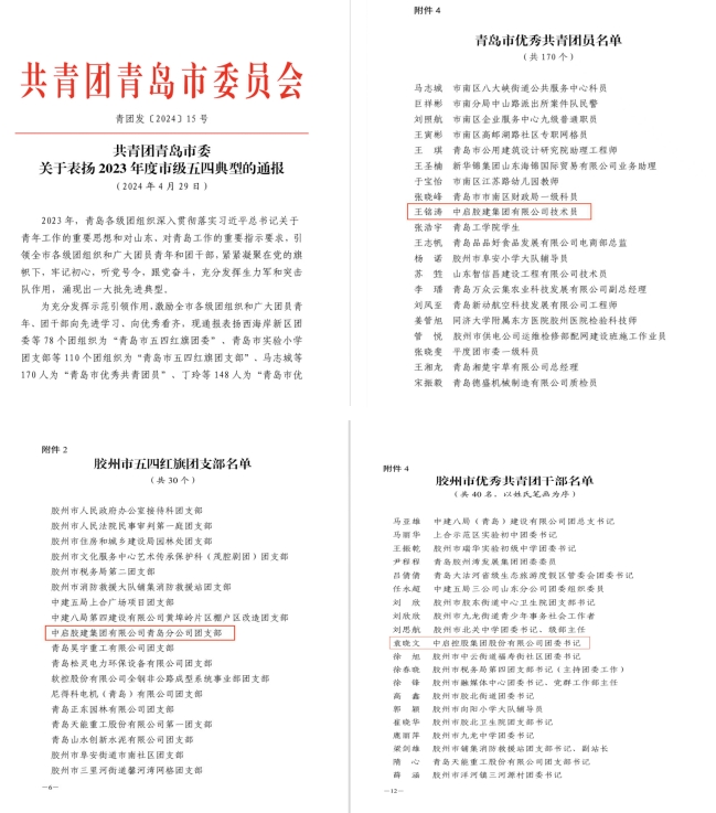 2024年是紀念五四運動105周年,也是新中國成立75周年。為傳承和弘揚“五四”精神,全面展現上合新區青年奮發進取的精神風貌,膠州團市委在膠州市市民文化中心二樓舉行“奮進青春力量,建功五大新城”膠州市紀念五四運動105周年主題團日暨青春故事宣講會活動,膠州市委副書記劉濤出席并發表致辭,團市委書記孫傳奇帶領全體團員、團干部重溫入團誓詞,會上對全市“五四典型”進行通報表揚。中啟膠建集團有限公司青島分公司團支部榮獲2023年度“膠州市五四紅旗團支部”稱號,中啟膠建集團膠州分公司團員青年職工王銘濤榮獲“青島市優秀共青團員”稱號,中啟控股集團股份有限公司團委書記袁曉文榮獲“膠州市優秀共青團干部”稱號。