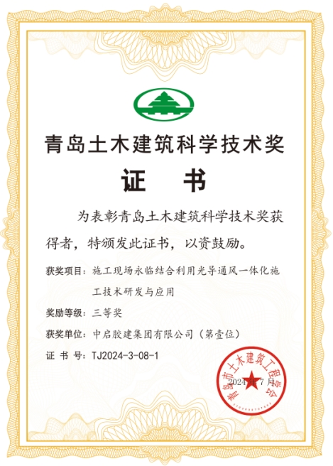 日前,在青島市土木建筑工程學(xué)會(huì)首次開展的“青島土木建筑科學(xué)技術(shù)獎(jiǎng)”評(píng)選活動(dòng)中,我公司的研發(fā)項(xiàng)目《施工現(xiàn)場(chǎng)永臨結(jié)合利用光導(dǎo)通風(fēng)一體化施工技術(shù)研發(fā)與應(yīng)用》榮獲三等獎(jiǎng)。
