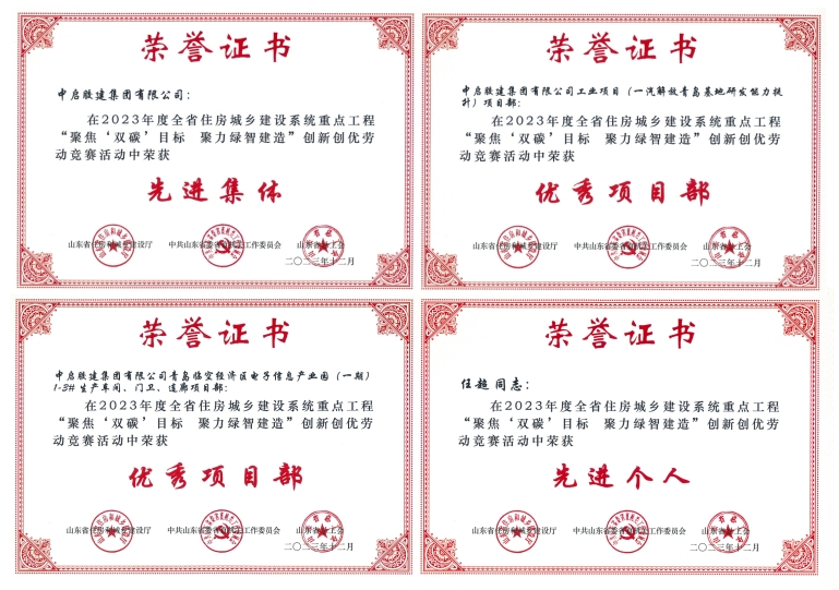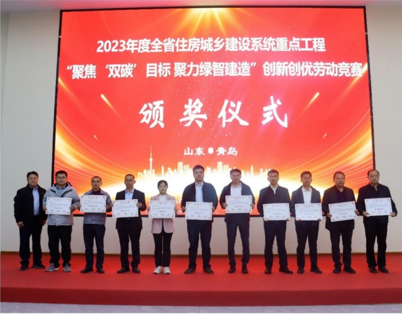 會議同期為青島市獲得2023年度全省住房城鄉(xiāng)建設系統(tǒng)重點工程“聚焦‘雙碳’目標 聚力綠智建造”創(chuàng)新創(chuàng)優(yōu)勞動競賽榮譽的先進集體、優(yōu)秀項目部和先進個人進行了頒獎。公司獲評“先進集體”榮譽稱號,公司工業(yè)項目(一汽解放青島基地研發(fā)能力提升)項目部和青島臨空經濟區(qū)電子信息產業(yè)園(一期)1-3#生產車間、門衛(wèi)、連廊項目部被評為“優(yōu)秀項目部”,任超獲評“先進個人”。