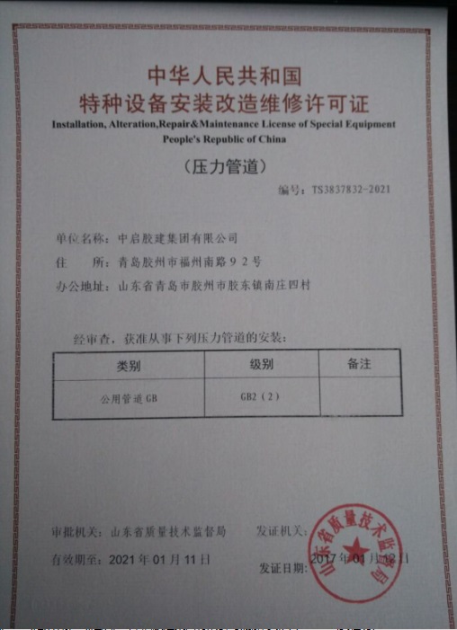 2017年1月12日,中啟膠建集團有限公司通過省質監局評審,獲得特種設備安裝改造維修許可證公用管道GB2(2)許可證書,公司將以此為契機,進一步拓展公司的業務范圍,積極參與城市綜合管廊工程,力爭實現突破。